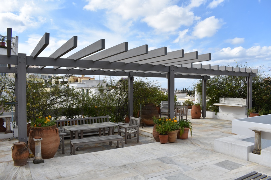 Wooden pergola from aged cedar wood , for residence in the center of Athens . A result of flawless aesthetics and functionality in full harmony with the environment.