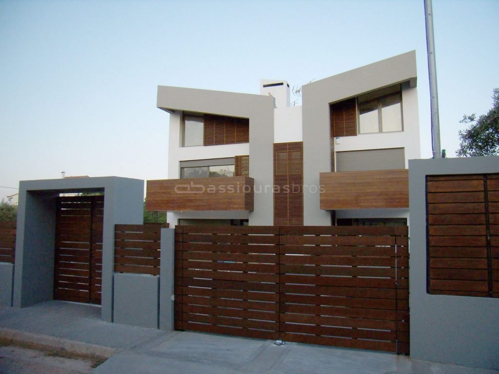 Εξωτερική επένδυση με ξυλεία IROKO, επεξεργασμένη για χρήση σε εξωτερικούς χώρους, με κρυφή στήριξη. Σκουρόχρωμη απόχρωση του ξύλου, με τις τέλεια επεξεργασμένες επιφάνειες, υπογραμμίζει τις δυναμικές γραμμές της κατοικίας.