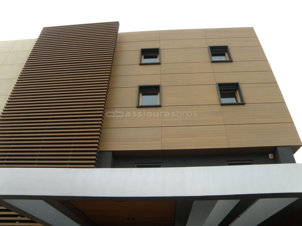 Εξωτερική επένδυση με ξυλεία Κόκκινου Κέδρου, με κρυφή στήριξη και επεξεργασία για χρήση σε εξωτερικό χώρο. Με άψογη τεχνική, δυναμικές γραμμές και επιλεγμένα φυσικά υλικά. Η κατασκευή ενσωματώνεται εντυπωσιακά στο περιβάλλον.