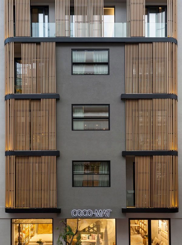 Ένα εκπληκτικό έργο με αναβάθμιση της όψης. Η υλοποίηση έγινε με περσίδες σε συρόμενα πλαίσια από ξυλεία Κόκκινου Κέδρου ποιότητας No. 2 Clear & Better Vertical Grain, και ανάρτηση των πλαισίων σε οδηγούς με πιστοποίηση φορτίου και για εξωτερική χρήση. Για το ξενοδοχείο της Coco-Mat στο Κολωνάκι, είναι πλέον δυνατή τόσο η διαχείριση του φωτός όσο και ο αποκλεισμός των αδιάκριτων βλεμμάτων. Στην εντυπωσιακή εικόνα συμβάλλουν οι λεπτές δοκίδες που είναι τοποθετημένες σε συρόμενα πλαίσια και σε σταθερά με κρυφή στήριξη, με άριστη συμμετρία και τεχνική, σε όμορφη ζεστή απόχρωση φυσικού ξύλου που έχει επεξεργαστεί κατάλληλα για χρήση σε εξωτερικό χώρο.