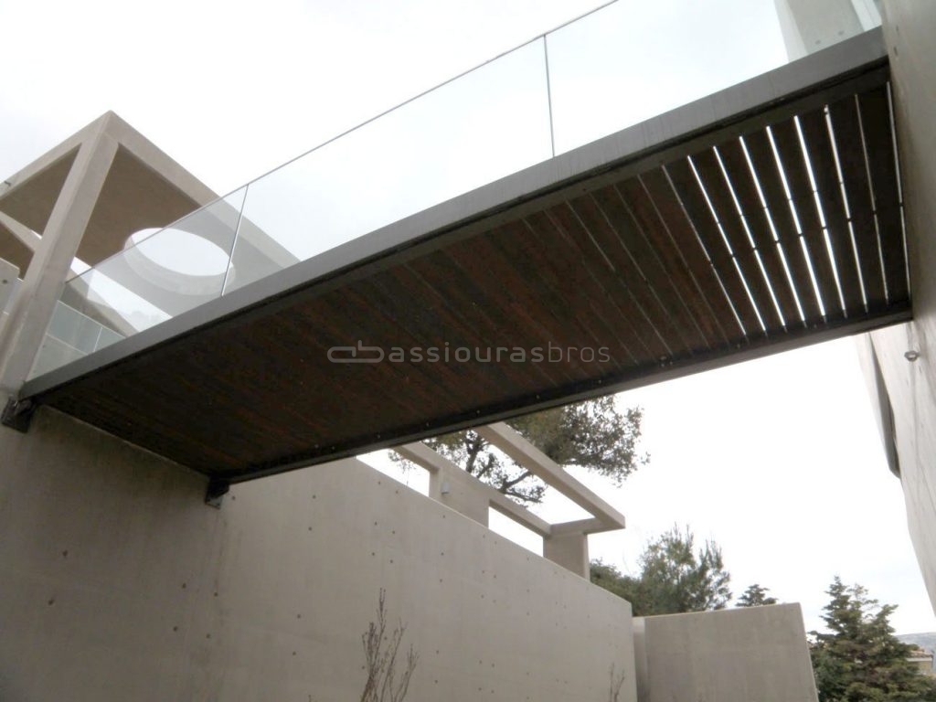 Ξύλινη κατασκευή γέφυρας εξωτερικού χώρου από ξυλεία Ιρόκο πλάτους 150mm με 1,8m πλάτος κατασκευής. Η στήριξη έγινε επάνω στα μεταλλικά άκρα της αερογέφυρας. Για αποφυγή κάμψης των σανίδων, τοποθετήθηκε κρυφό στήριγμα κατά μήκος της έτσι ώστε να δημιουργηθεί μια συμπαγής επιφάνεια και να κατανέμεται το βάρος ομοιόμορφα ώστε να μη δημιουργούνται στρεβλώσεις.