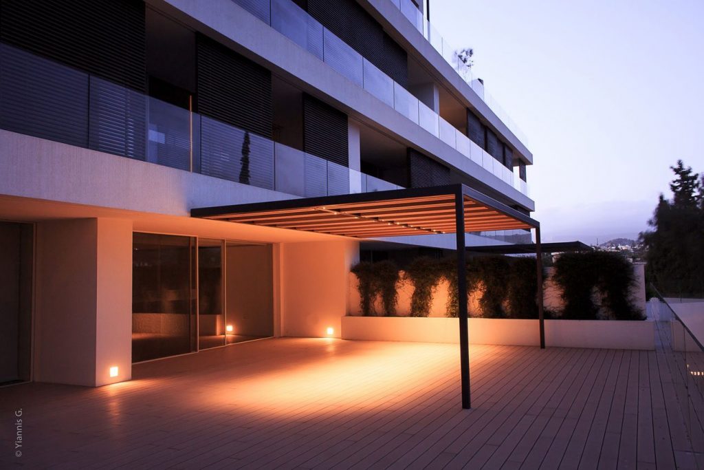 Δάπεδο εξωτερικού χώρου (deck) από συνθετικό υλικό της Resysta για ένα έργο 2.600 m2 στη Βουλιαγμένη, του πρώην ξενοδοχείου Αρμονία. Η στήριξη έγινε με κρυφούς συνδέσμους επάνω σε οδηγούς από το ίδιο υλικό. Η κατασκευή εδράζεται σε ρυθμιζόμενες βάσεις υπερυψωμένων δαπέδων της εταιρείας Impertek (τύπος Megamart, με ύψος 70-600 mm). Επίσης, στο έργο τοποθετήθηκε επένδυση και δοκίδες πέργκολας από το ίδιο υλικό, για το αρχιτεκτονικό γραφείο της ISV.