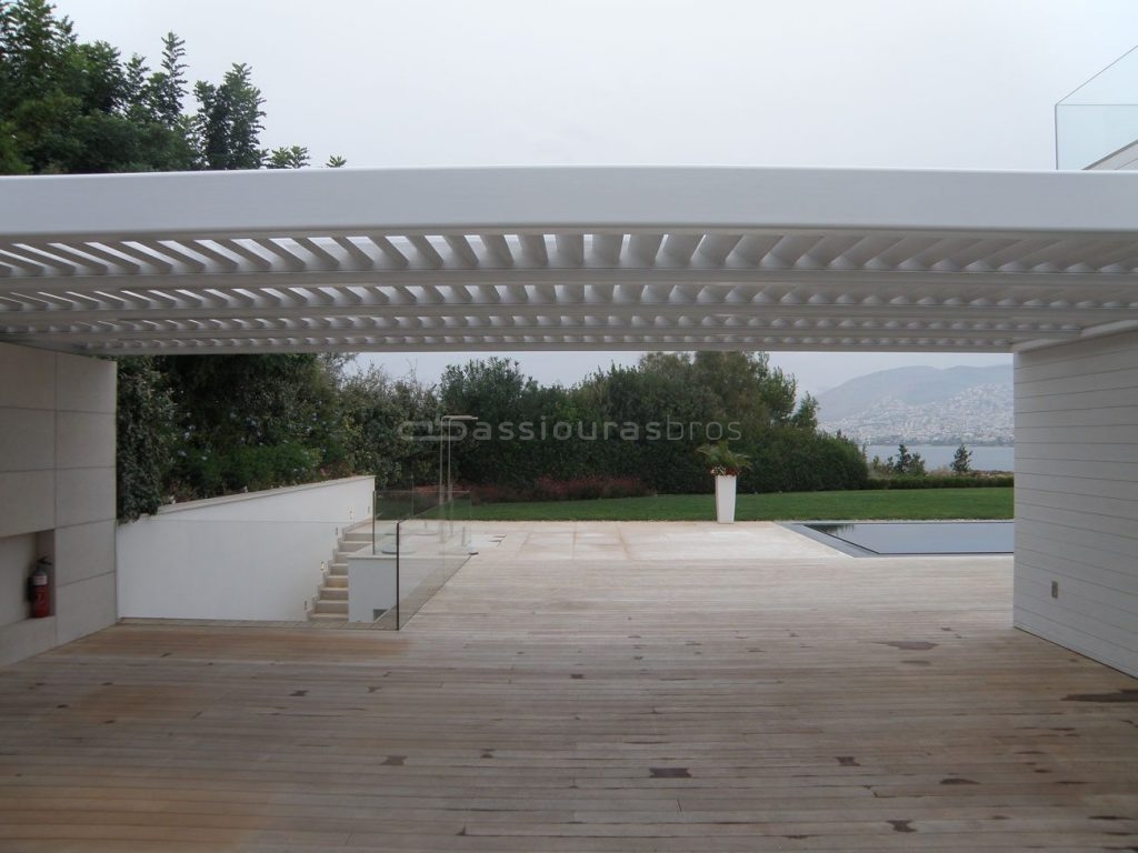 Πέργκολα εξ ολοκλήρου από ξυλεία Κόκκινου Κέδρου, κατάλληλα επεξεργασμένη για κατασκευή σε εξωτερικούς χώρους. Ο σκελετός και οι περσίδες συνδέονται με κρυφό τρόπο, με συνδέσμους εξειδικευμένους για χρήση σε ξύλο και πιστοποίηση φορτίων, για εξαιρετικά κομψή, αλλά και απόλυτα ασφαλή συνδεσμολογία. Σε λευκή απόχρωση και με επεξεργασία για ανάγλυφη υφή, οι σταθερές, επικλινείς περσίδες επιτρέπουν τον επιθυμητό φωτισμό του χώρου. Από το αρχιτεκτονικό γραφείο Ζέππος – Γεωργιάδη.