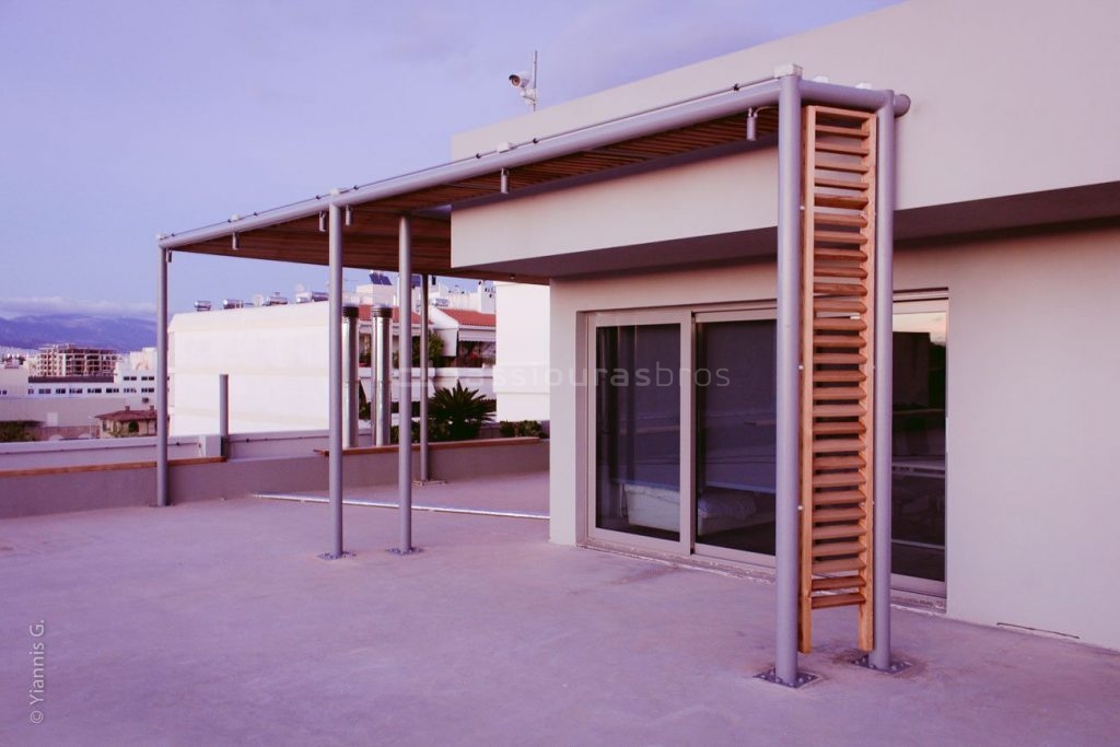 Πέργκολα από ξυλεία Κόκκινου Κέδρου, ένα ξύλο με εντυπωσιακό φυσικό χρώμα, κατάλληλο για εξωτερικούς χώρους τόσο λόγω της κατάλληλης επεξεργασίας του όσο και λόγω της φύσης του. Καθώς πρόκειται για ένα εύκολα επεξεργάσιμο υλικό, με πολλές δυνατότητες και εφαρμογές, ήταν μια άριστη επιλογή για το συγκεκριμένο έργο. Οι περσίδες διαμορφώθηκαν άψογα για να προσαρμοστούν στο βασικό μεταλλικό σκελετό, συμπληρώνοντας την εικόνα μιας ανάλαφρης και κομψής κατασκευής. Από το αρχιτεκτονικό γραφείο Αγνή Κουβελά και Συνεργάτες.