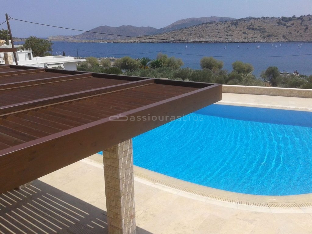 Ξύλινη πέργκολα από επικολλητή ξυλεία με κρυφούς συνδέσμους που έχουν σχεδιαστεί για συνδέσμους ξύλου, με πιστοποίηση φορτίων και προστασία για παράκτια χρήση. Εδώ η σκίαση είναι το αποτέλεσμα περσίδων που έχουν κατασκευαστεί από το ίδιο υλικό και είναι τοποθετημένες με κλίση. Αρμονία, αισθητική και ασφάλεια, σε πλήρη συμφωνία με το περιβάλλον και τις ανάγκες του τελικού χρήστη, από τον αρχιτέκτονα Ηλία Γαλάνη.