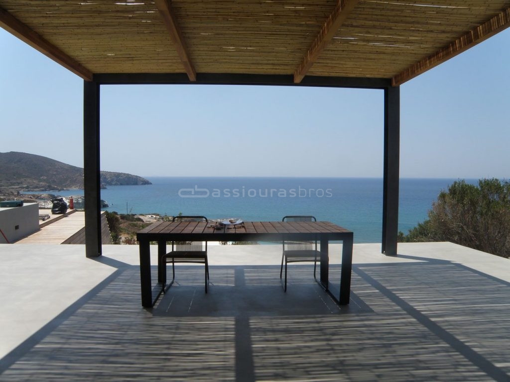 Ξύλινη πέργκολα από επικολλητή ξυλεία iroko, με συνδέσεις από κρυφούς συνδέσμους για ξύλο με πιστοποίηση φορτίων και προστασία για παράκτια χρήση. Η σκίαση επιτυγχάνεται με πεπαλαιωμένο καλάμι bamboo τοποθετημένο επάνω στο βασικό σκελετό. Λιτή κατασκευή, με αυστηρές γραμμές, σε συμφωνία με τις τοπικές προδιαγραφές αρχιτεκτονικής, χωρίς να υστερεί σε αισθητικό αποτέλεσμα ή σε ασφάλεια. Μελέτη από το γραφείο VAMVOUNI-MALLIS.