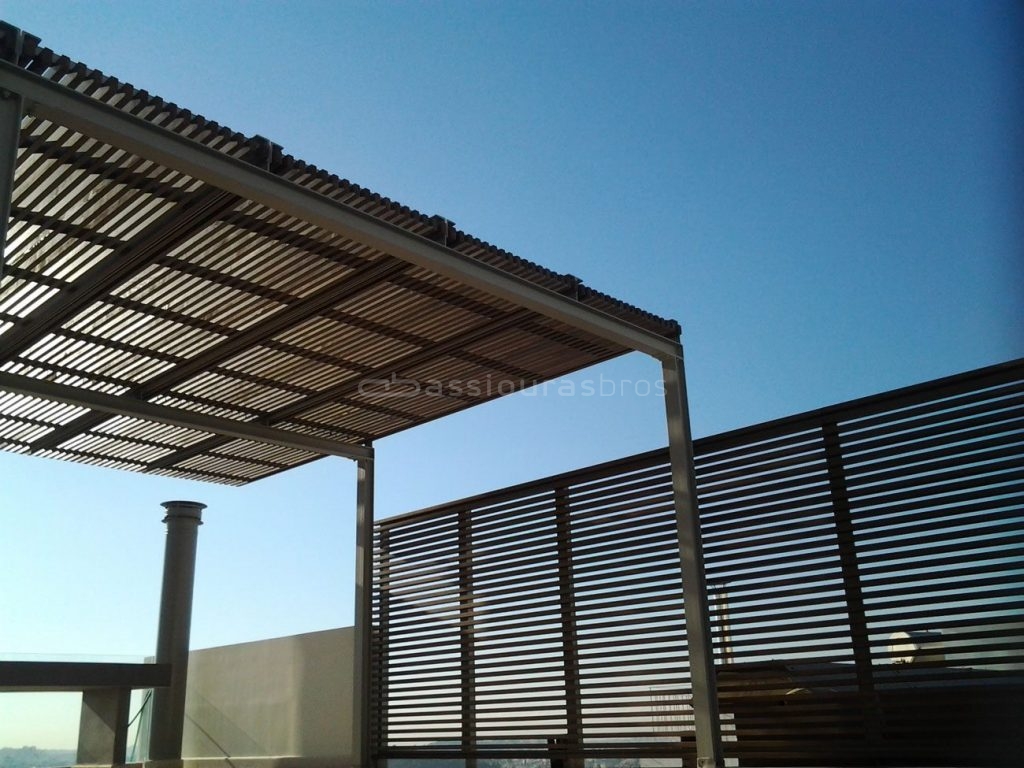 Τόσο για την πέργκολα όσο και για την περίφραξη του χώρου χρησιμοποιήσαμε σταθερές περσίδες από ξυλεία Δυτικού Κόκκινου Κέδρου, με κρυφή στήριξη. Η ξυλεία έχει υποστεί κατάλληλη επεξεργασία για να προστατεύεται κατά την έκθεσή της στις καιρικές συνθήκες.