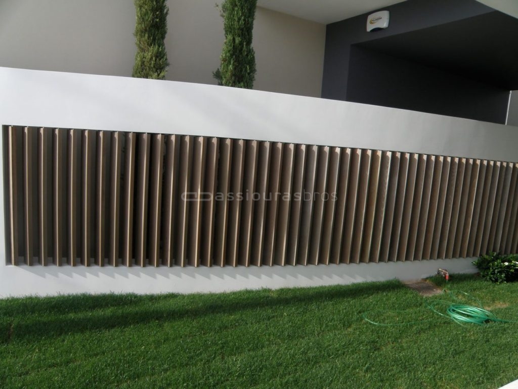 Κάθετες, σταθερές περσίδες από ξυλεία Δυτικού Κόκκινου Κέδρου, τοποθετημένες επικλινώς, με κρυφούς συνδέσμους και κατάλληλη επεξεργασία για χρήση σε εξωτερικό χώρο.