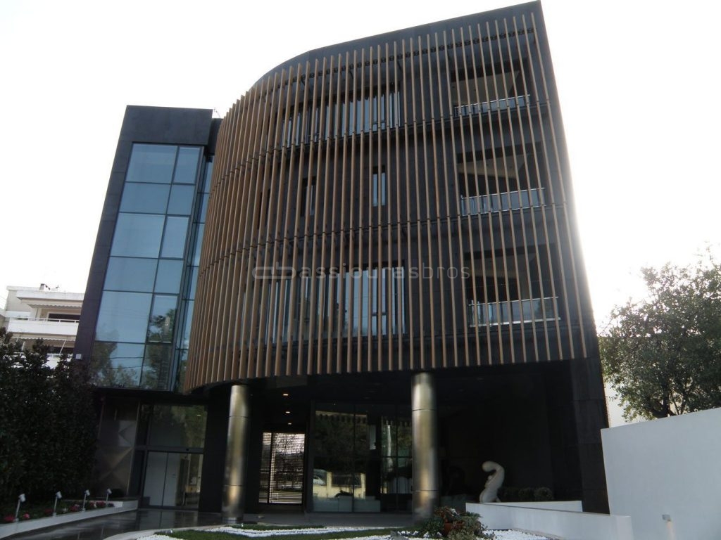 Επικολλητή ξυλεία Δυτικού Κόκκινου Κέδρου για τις σταθερές περσίδες σε ιδιωτική κλινική. Οι δοκίδες, πάχους 85mm και πλάτους 245mm, είναι τοποθετημένες σε κάθετη φορά. Ένα έργο που από το 2008 κοσμεί την περιοχή του Χαλανδρίου, χωρίς καμία συντήρηση.