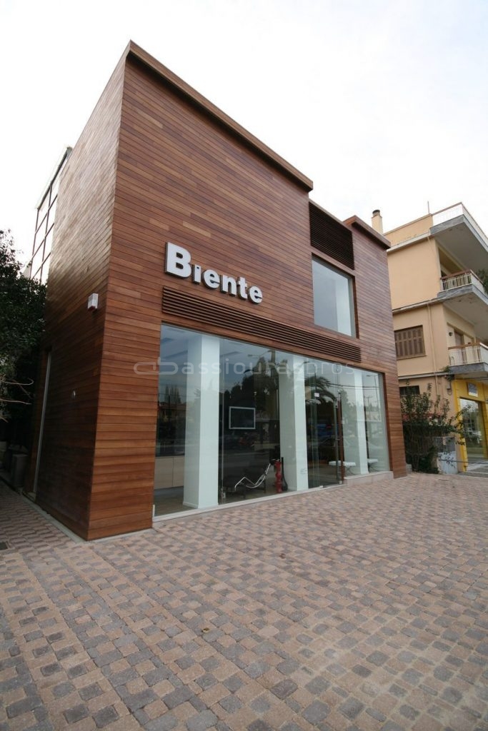 Εξωτερική επένδυση σε επαγγελματικό χώρο, από σανίδες ξυλείας Ιρόκο πλάτους 12cm, τοποθετημένες με κρυφή στήριξη. Η χρονολογία κατασκευής του έργου είναι το 2006 αποδεικνύοντας ότι η σωστή επιλογή ξύλου και υλικών στήριξης σε συνδυασμό με την τεχνογνωσία και την κατάρτιση επιτρέπουν στην κατασκευή μία αναλλοίωτη στο χρόνο αισθητική. Η αλυσίδα καταστημάτων BIENTE είναι οι πρώτες μεγάλης κλίμακας και ολοκληρωτικής έκθεσης στις καιρικές συνθήκες ξύλινες επενδύσεις στη χώρα μας.