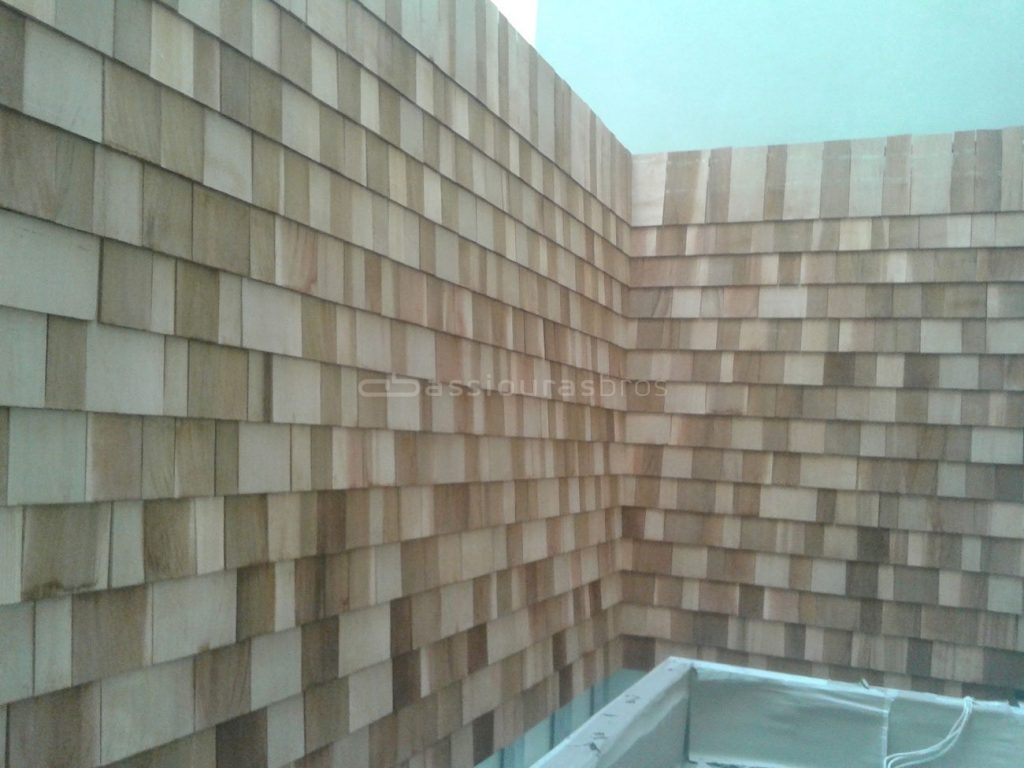 Εξωτερική επένδυση σε διακοσμητικό καταρράκτη στο κατάστημα της Cocomat στο Κολωνάκι, από Shindles ξυλείας κόκκινου δυτικού κέδρου. Κομμάτι-κομμάτι συμπληρώνεται η εικόνα μιας μοναδικής και διόλου βαρετής επιφάνειας στη φυσική απόχρωση του ξύλου, που αλλάζει μορφή με τη διέλευση του νερού.