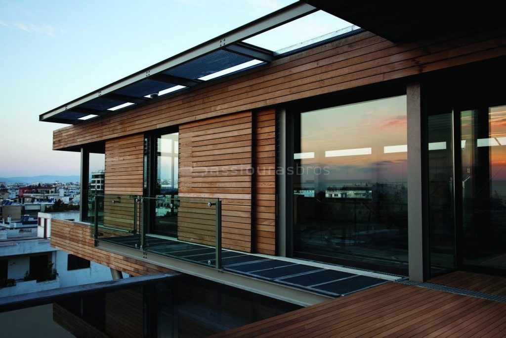 Ο εσωτερικός χώρος σκιάζεται από περσίδες σε συρόμενα πλαίσια, κατασκευασμένες από ξυλεία Δυτικού Κόκκινου Κέδρου και με πάχος κατασκευής μόλις 30 mm. Μια εντυπωσιακή κατασκευή με άριστη συμμετρία και τεχνική, σε όμορφη ζεστή απόχρωση φυσικού ξύλου που είναι κατάλληλο για χρήση σε εξωτερικό χώρο. Από μελέτη του αρχιτεκτονικού γραφείου ΑΚΚΜ.