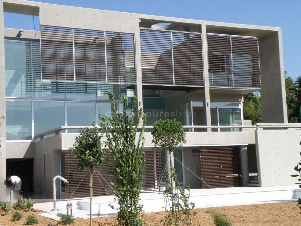 Περσίδες σε επάλληλα συρόμενα πλαίσια, από ξυλεία Ιρόκο επεξεργασμένη κατάλληλα για χρήση σε εξωτερικό χώρο. Σταθερές δοκίδες, τοποθετημένες με κρυφή στήριξη, σε οριζόντια θέση με μεγάλα διάκενα μεταξύ τους, προσφέρουν την προστασία από το εκτυφλωτικό φως που επιθυμούν οι ένοικοι, συμπληρώνοντας λειτουργικά τη μοντέρνα πρόσοψη της κατοικίας.