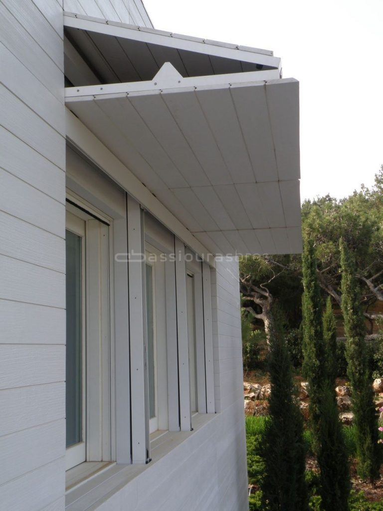 Πλαίσιο με αναδίπλωση από ξυλεία Δυτικού Κόκκινου Κέδρου, επεξεργασμένη κατάλληλα για προστασία από τις καιρικές συνθήκες. Το πλαίσιο έχει τοποθετηθεί οριζόντια με κρυφή στήριξη, με άριστη συμμετρία ως προς την υπόλοιπη επένδυση της όψης, με προστασία πλήρους κάλυψης του φυσικού ξύλου. Ενσωματώνεται άψογα στην κατασκευή που διακοσμεί την πρόσοψη του κτιρίου και επιτυγχάνει την επαρκή σκίαση στο εσωτερικό της κατοικίας.